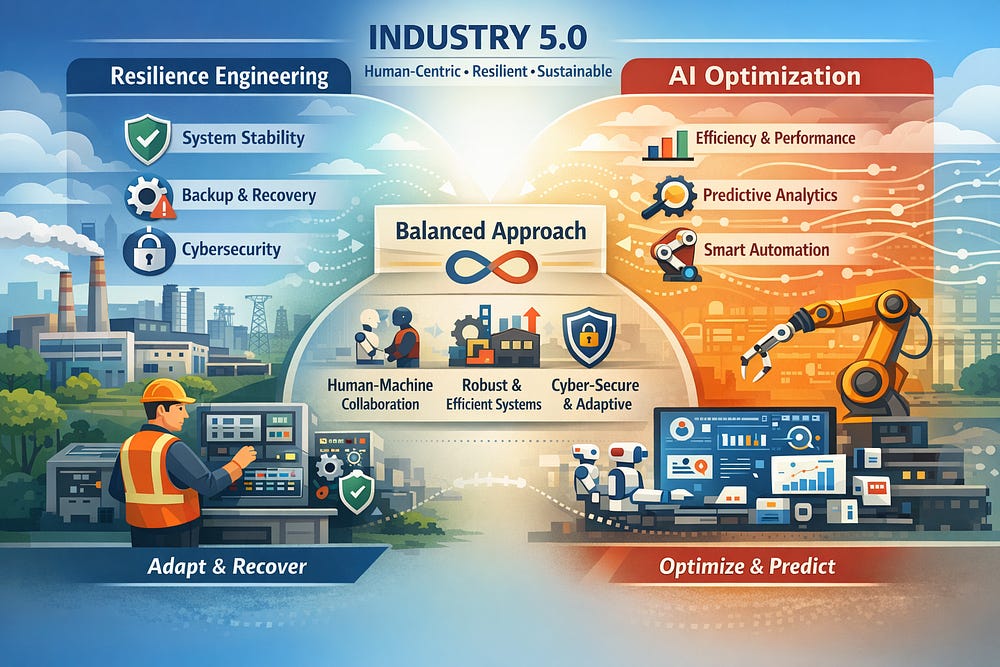 In Industry 5.0, both Resilience Engineering and AI Optimization are essential, but they serve different purposes. Resilience engineering ensures robustness and survivability, while AI optimization drives efficiency and predictive performance.